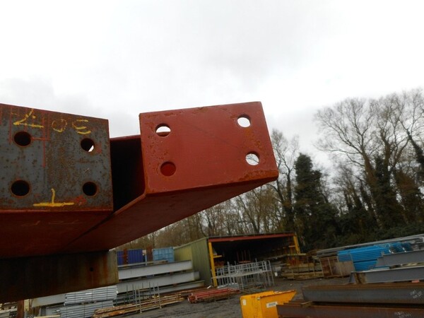 Second hand and has cut out and end plate at one end. The other end has a cut out, an angle cut and an end plate. Column has been measured to usable length. This column also has holes in the web and the flange. Please see pictures for condition.