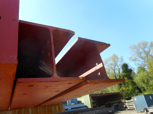 Painted red, with end plate at one end and holes in the web.