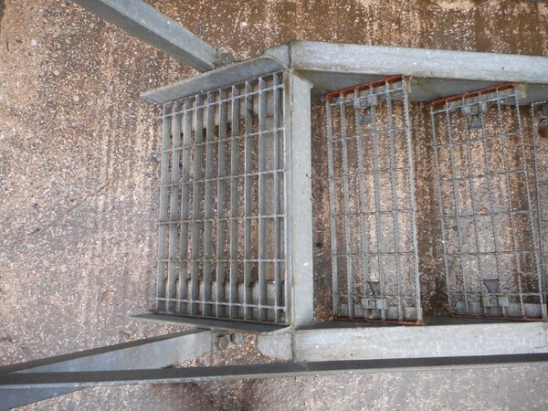 Galvanised with open floor forge treads 595mm x 210mm with a serrated edge. 100mm x 40mm aperture, with 25mm x 5mm flat bar.
